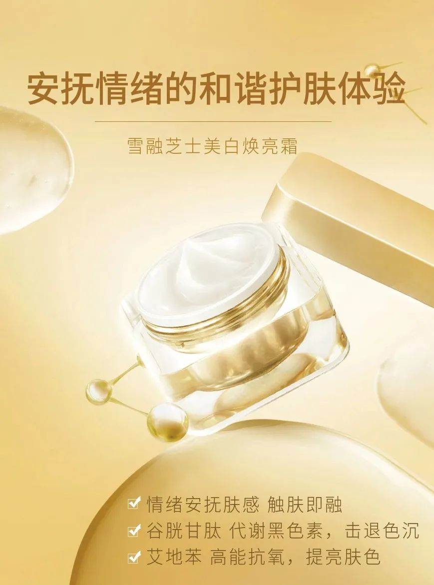 【谷胱甘肽】抑制黑色素形成,美白提亮肤色,熬夜也发光。【艾地苯】有效抗氧化,并修复自由基对细胞造成的损伤。【轻乳酪质地】触肤即融,用后皮肤即时柔润有光泽。
